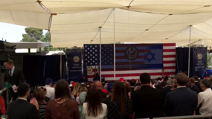 Em uma mensagem gravada e transmitida durante a solenidade, Donald Trump defendeu mais uma vez sua decisão de transferir a embaixada para Jerusalém, afirmando que “os Estados Unidos permanecem totalmente comprometidos com facilitar um acordo de paz duradouro”.